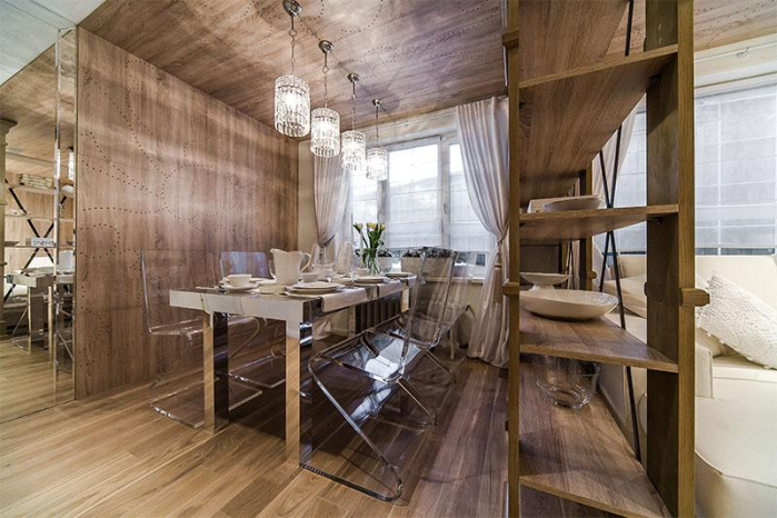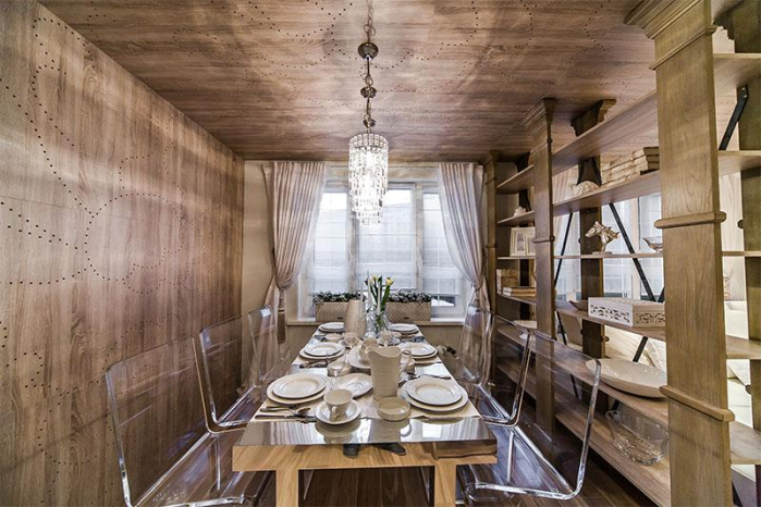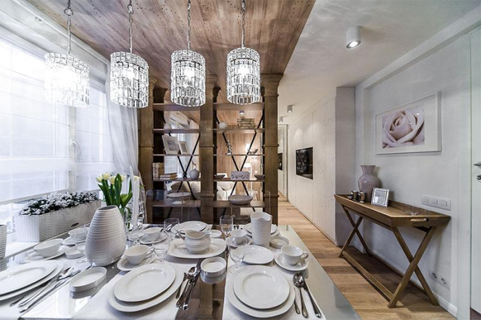 Светлые оттенки как нельзя лучше подходят для создания ощущения легкости и воздушности небольшого полуподвального пространства. Использование тюля на римских шторах – нестандартный и эффектный прием. Он позволил еще больше высветлить помещение и прекрасно подчеркнул замысел дизайнера. Практичная портьера из ткани с жаккардовым плетением прослужит не один год и будет радовать хозяев благородным внешним видом и роскошной фактурой.
