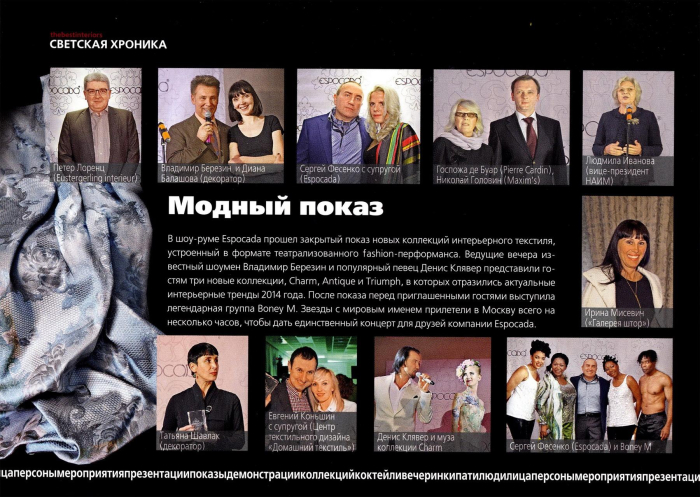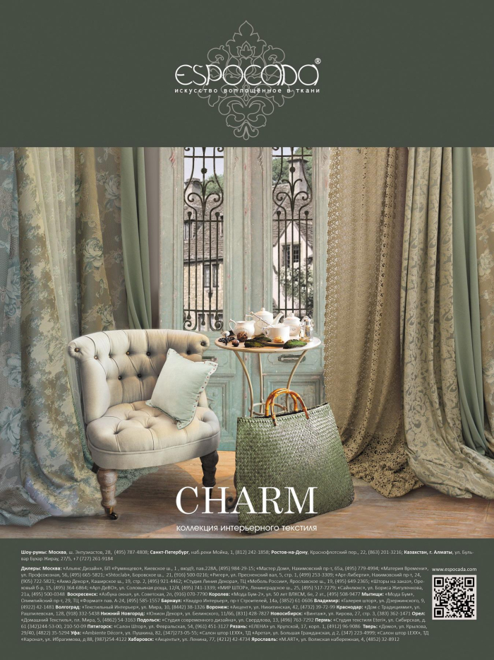 В ноябрьском номере журнала вышла полосная реклама новой коллекции Charm. Коллекция воплощает всю красоту и изящество начала XX века в сочетании с энергетикой и технологиями третьего тысячелетия. В рубрике «Светская хроника» смотрите фоторепортаж с закрытого показа новых коллекций Еspocada, который прошел 24 сентября в московском шоу-руме компании.