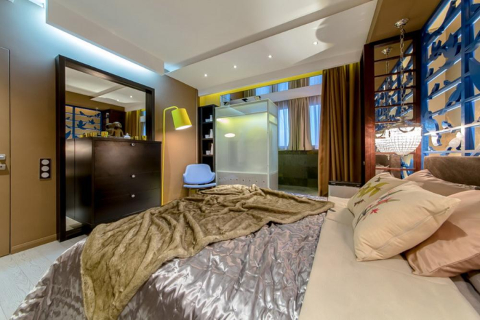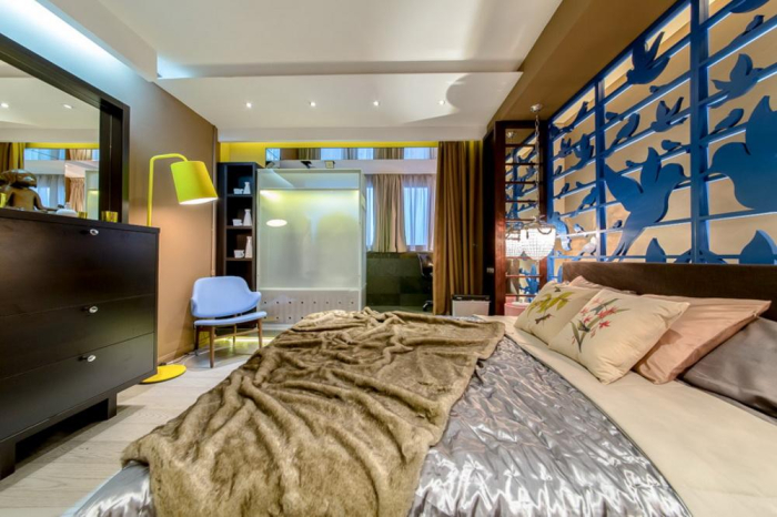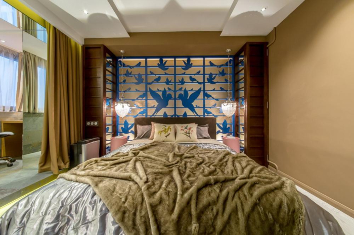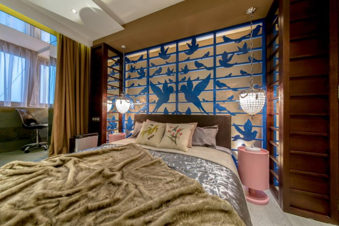 Дизайнеры постарались не отступать от избранной цветовой линии. Поэтому в интерьере сделан акцент на темные нейтральные оттенки, бежево-коричневую и серебристую гамму. В результате вся концепция получилась выдержанной и сбалансированной. Это помогает сфокусировать внимание на главном элементе декора - настенном панно с синими птицами.