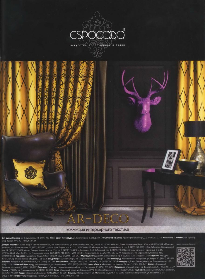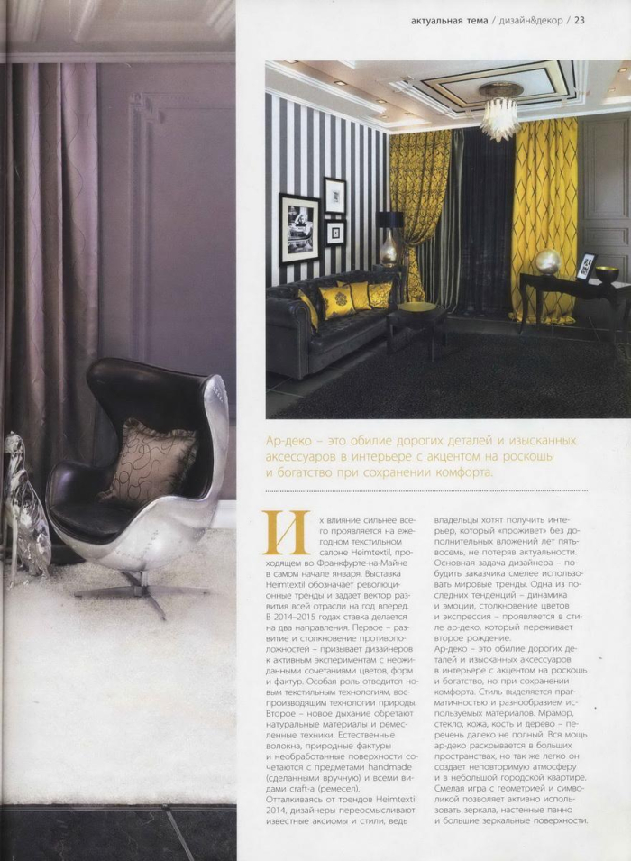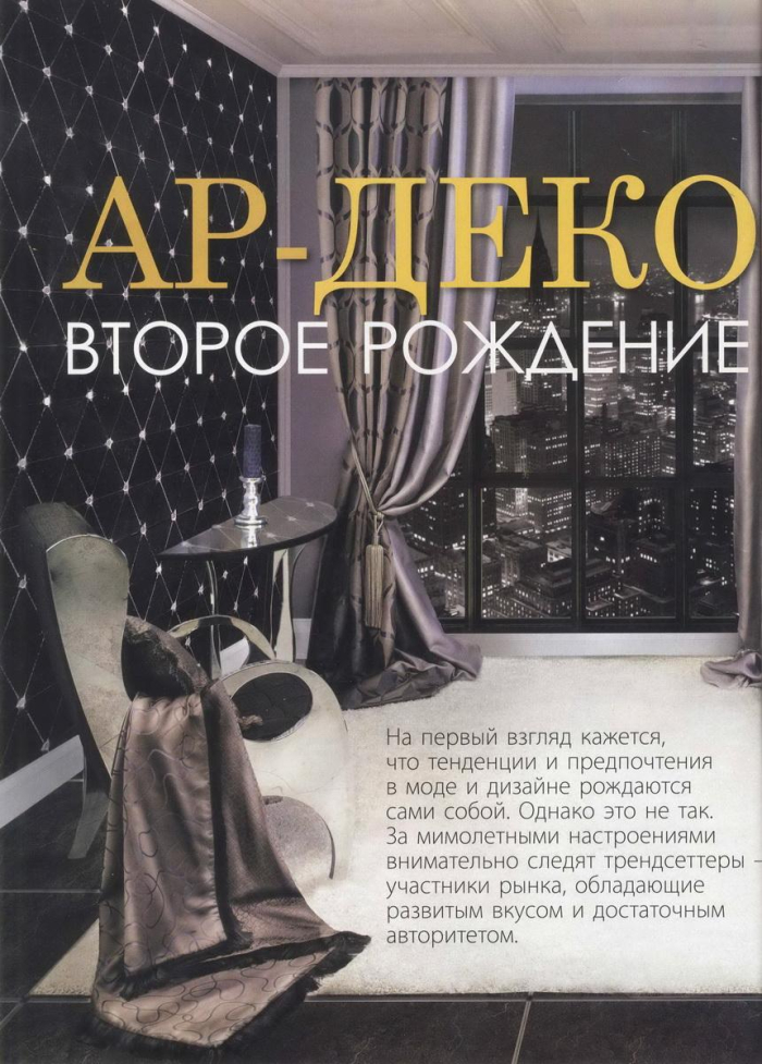 Актуальной темой журнала стал роскошный стиль ар-деко. О нем рассказывает генеральный директор компании Espocada Сергей Фесенко в статье «Ар-деко – второе рождение».