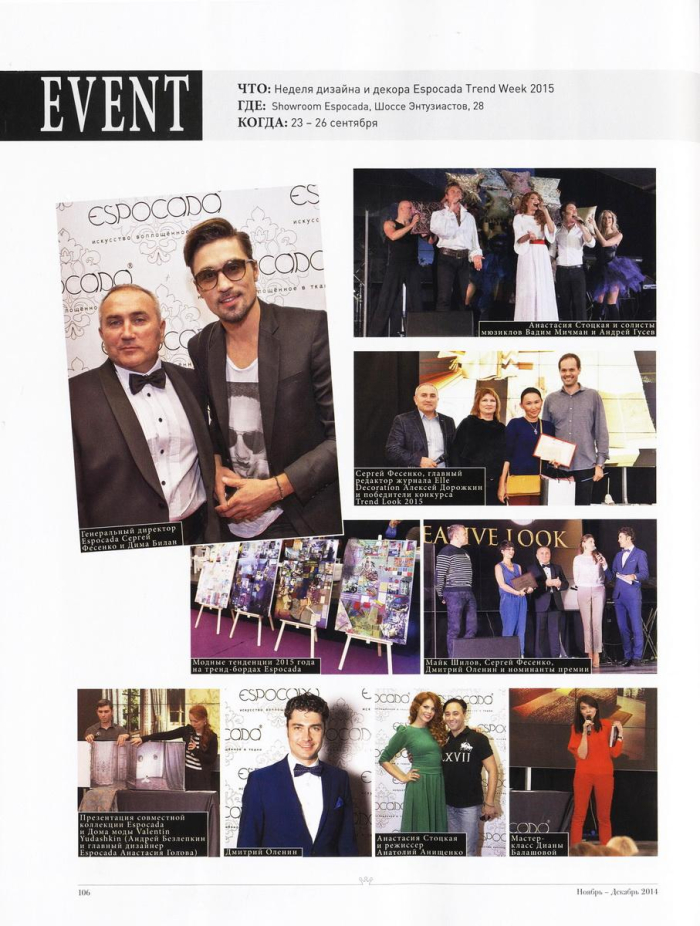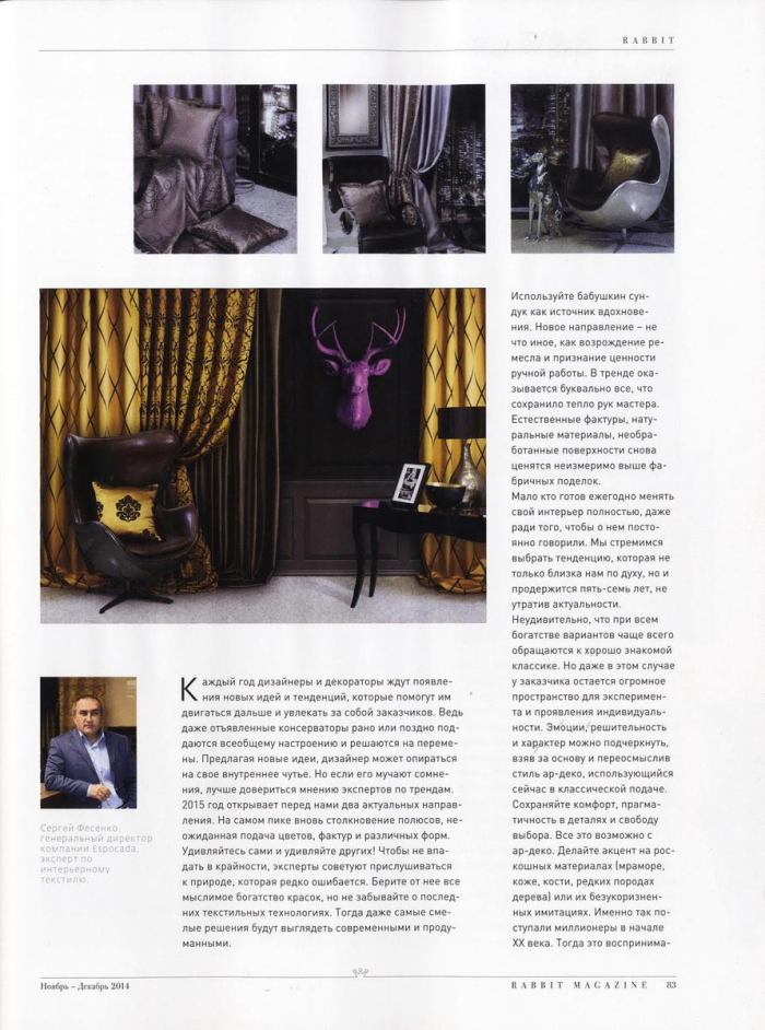 В последнем номере 2014 года журнал «Rabbit Magazine» публикует взгляд на текстильные тренды генерального директора компании Espocada Сергея Фесенко и фотоотчет с недели дизайна и декора Espocada Trend Week.