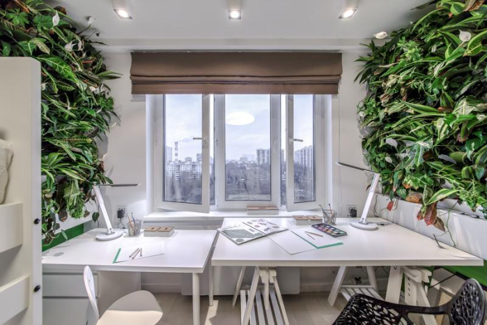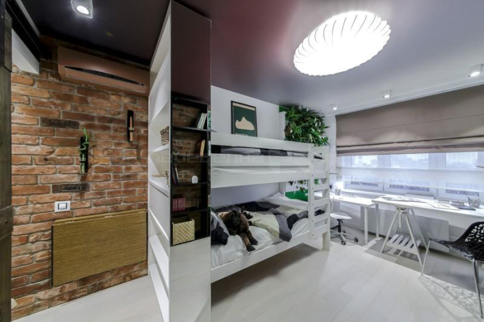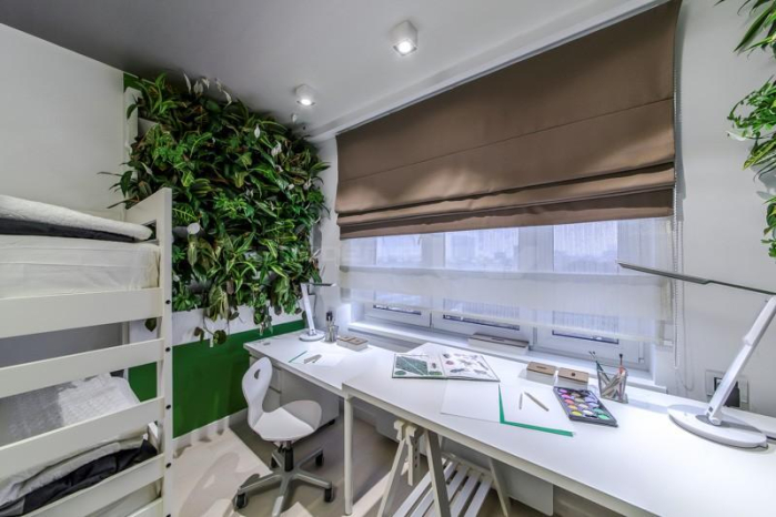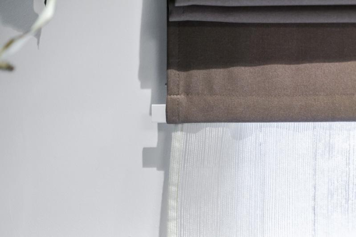 Экзотическое настроение дизайнеры подчеркнули и в выборе текстиля. Легкая органза из коллекции «Twilight» c оригинальным вертикальным рисунком из толстых неоднородных по толщине нитей имитирует ручную работу и натуральные волокна. Такие ткани особенно популярны в декоре, поэтому органза удачно попала в модный тренд. Для плотной основы римской шторы была отобрана однотонная портьерная ткань из той же коллекции, но в коричневой гамме.