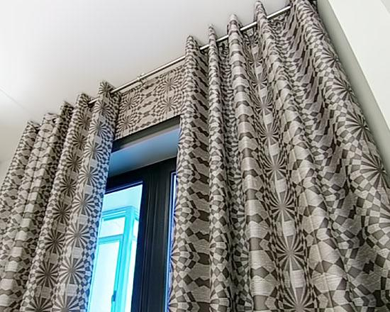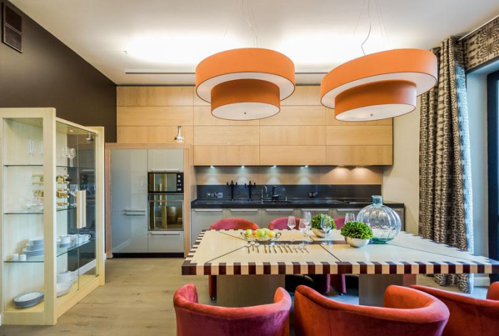 Активный и контрастный рисунок ткани из коллекции «Tempo» стал настоящей находкой для интерьера, в котором любая деталь несет в себе дух эксперимента и новаторства. Чтобы смягчить впечатляющий эффект от геометрии, дизайнер добавила на окна однотонную ткань из коллекции «Twilight» в спокойной коричневой гамме. Небольшая выработка на полотне привлекает взгляд, и делает ткань более интересной и статусной.