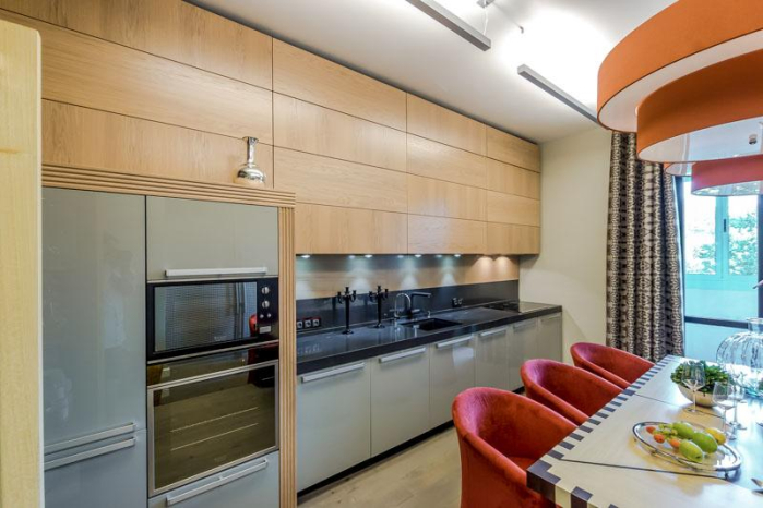 На кухне астрофизиков Жюльетта Ситникова разыграла партию в ассоциативные шахматы: черное и белое, светлое и темное. При этом шахматные клеточки на обеденном столе, напротив, не контрастные, а из разных пород дерева, инкрустированные в технике маркетри.