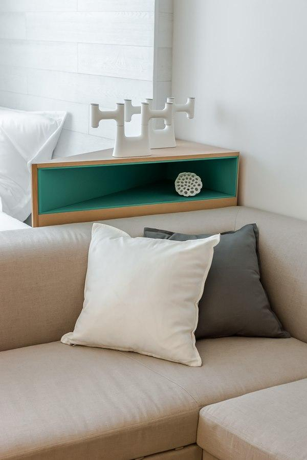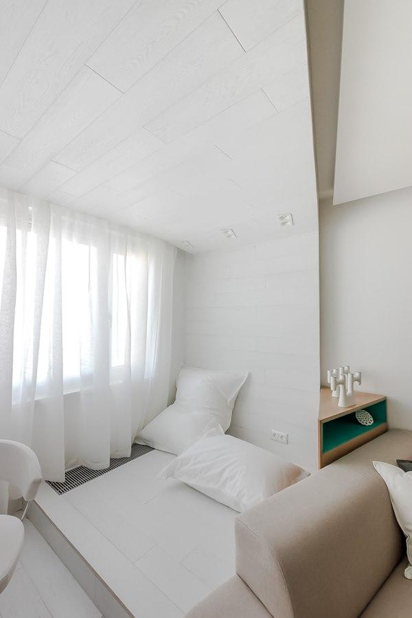 Обивка дивана тканью с фактурой «под натуральный лен» вдохнула в ультрасовременный интерьер оттенок естественности и природной чистоты. В футуристических линиях комнаты этот прием декорирования не бросается в глаза, однако безошибочно дает о себе знать, стоит лишь сесть на диван. Грубоватая фактура ткани контрастирует с общей однородной светлой гаммой, в которой чувствам хочется на чем-то остановиться и обрести связь с реальностью.