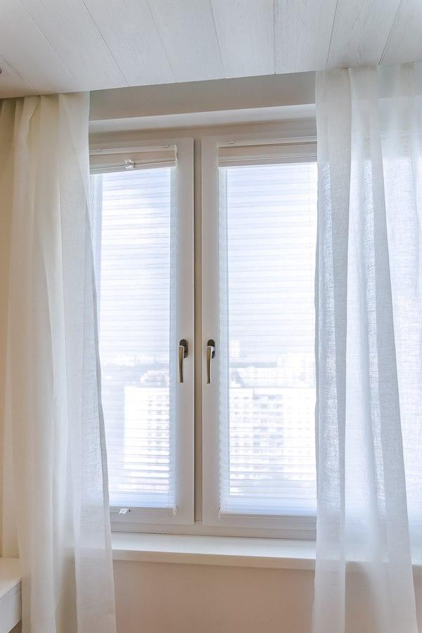 Окна декорированы практичным однотонным тюлем Espocada из искусственного волокна с имитацией льняной рогожки. Выбор цвета был продиктован общим решением интерьера в светлых тонах. Это помогло зрительно расширить небольшую комнату и сконцентрировать внимание на акцентах проекта - изумрудных вставках с африканскими жуками.