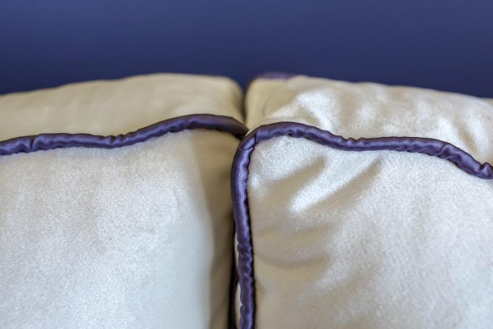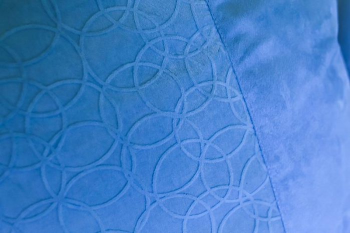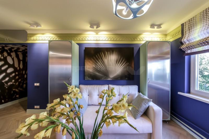 На чехлы для диванных подушек дизайнеры взяли искусственный шелк Espocada «Duplex» в активном фиолетовом цвете. Эта необычная ткань имеет две стороны, каждая из которых может использоваться для декорирования. Фактура одной стилизована под дикий шелк - на ней видны характерные для этой нити неравномерные утолщения-узелки. Вторая отливает сдержанным глянцем и напоминает мерцание звезд в глубоком космосе.