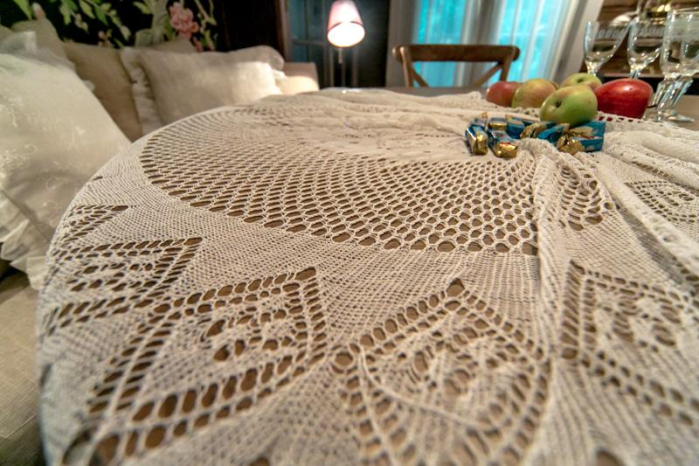 Проект не мог обойти вниманием кружево. Кружевная скатерть чайного столика соседствует с подушками, украшенными ультрамодным кружевом Espocada «Elizabeth». Тончайшее плетение цветочных мотивов и элегантный фестон подчеркивают дух интеллигентной «профессорской» дачи 1950-х.