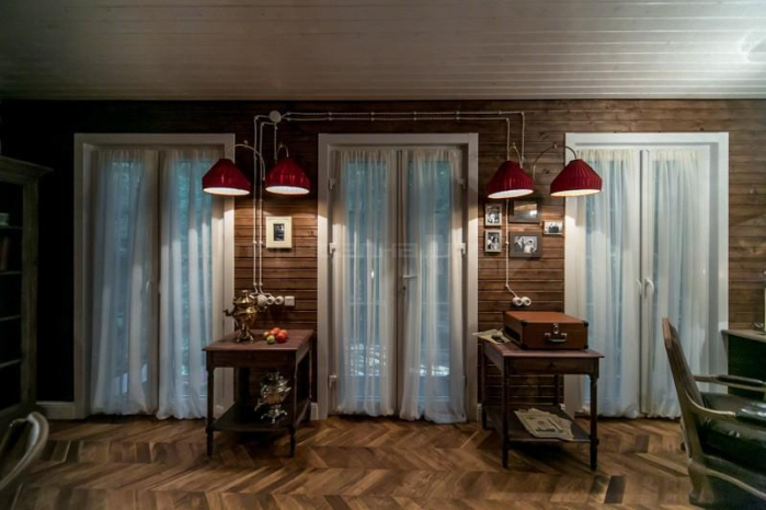 Дизайнеры полностью изменили интерьер дачной пристройки. В ней развернулась настоящая винтажная история в теплых коричневых тонах с вкраплениями красного и зеленого. Красные абажуры обтянуты тканью из коллекции Espocada «Bloom» с едва заметным клетчатым рисунком и характерной фактурой. Яркое пятно света от светильника в сочетании с красным подчеркивает теплый оттенок помещения и создает невероятные уют и гармонию, которые так хочется получить в загородном доме.
