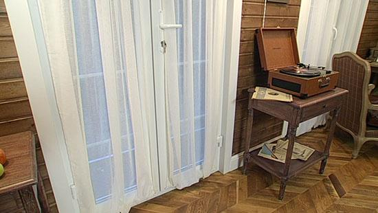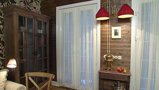 Прохладная пристройка с окнами в лес стала верандой в стиле ретро. Лампы с абажурами, окна с перекрестиями, буржуйка, патефон – милые атрибуты стародачной московской жизни создали обстановку, о которой так мечтали герои передачи.