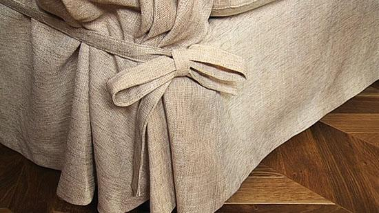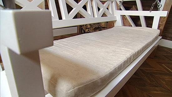 Уютный загородный дом невозможно представить себе без декоративных подушек. В проекте дизайнеров Анастасии Рыковой и Анны Денисовой «подушечная история» разворачивается сразу в нескольких плоскостях пространства. На качелях удобно расположились двухцветные подушки. Для них были выбраны сразу две ткани: темно-желтая рогожка «Soft» и золотисто-лимонная ткань «Bloom». Матрац оформлен нежным бежевым шениллом. С помощью этих простых приемов дизайнерам удалось создать комфортное место для спокойного семейного отдыха.