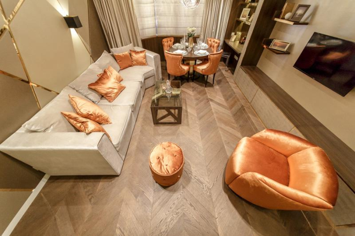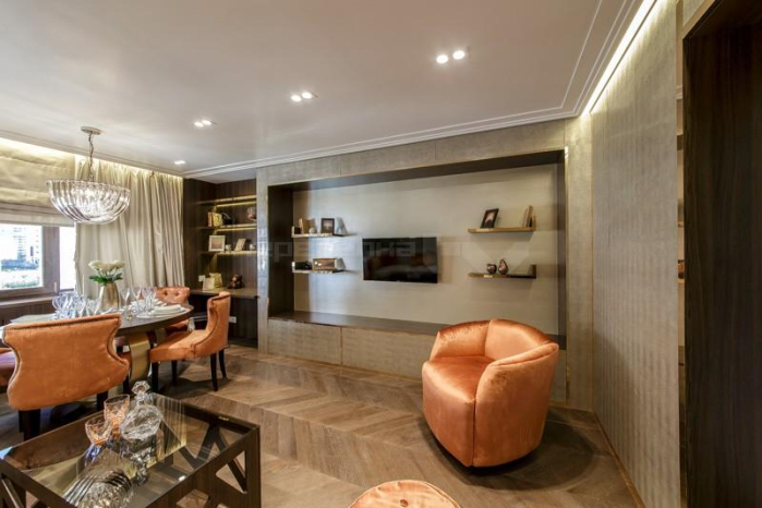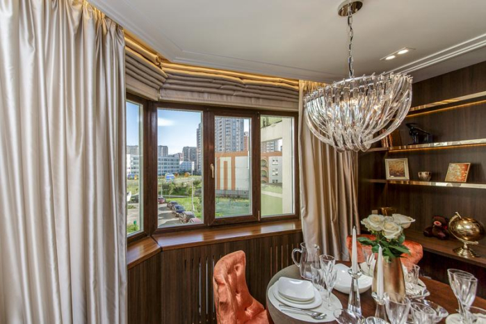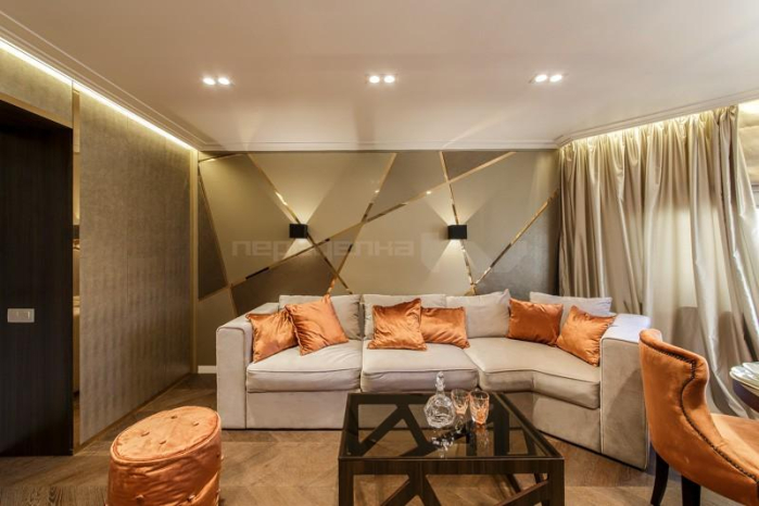 Чтобы вдохнуть в пространство жизненную энергию, дизайнер решила пойти двумя путями. Во-первых, на окнах появились нежно-бежевые сатиновые портьеры из коллекции Duos. Роскошные переливы света на складках заметно оживили комнату и создали в ней особенную ауру. Это же ощущение тепла и комфорта подчеркнули бежевые римские шторы с тканью-кольчугой из коллекции Ar Deco. Весь текстиль прекрасно гармонирует с теплым цветом стен, которые «расчерчены» стремительными линиями благородного золота.