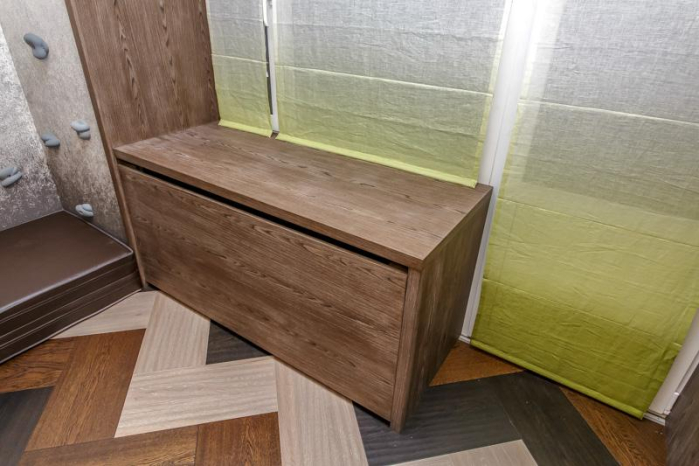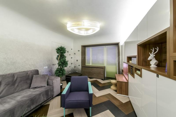 Вместо унылого «советского шика» семья Пискуновых получила антивандальную гостиную с зеленым туманом из ткани Venesto. В нем могут отдохнуть и взрослые и дети. Основной темой проекта стали плавные переходы цветовых оттенков - серого на стенах и зеленого на оформлении окон.