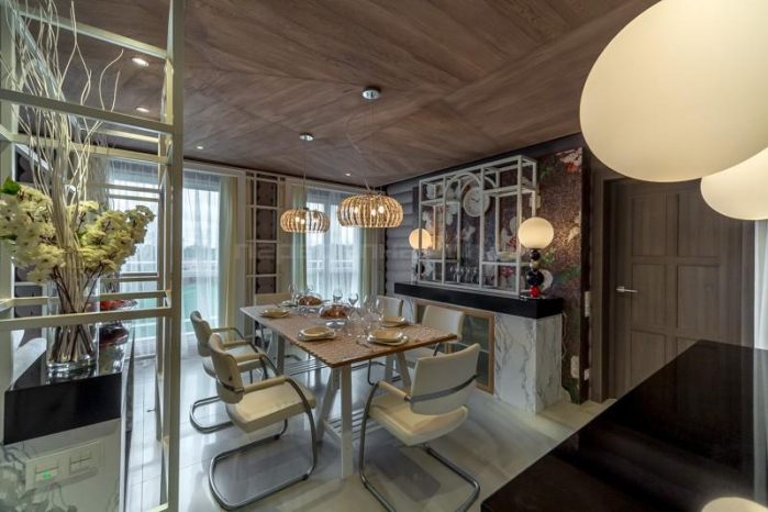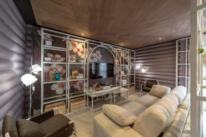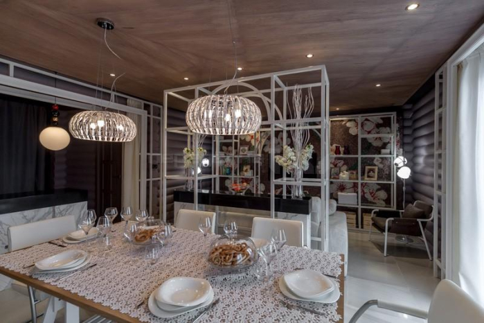 Ажурная металлическая конструкция, изящный текстиль, стильная мебель и великолепное настенное панно превратили деревянную «избушку» героев «Дачного ответа» в современное дизайнерское пространство.