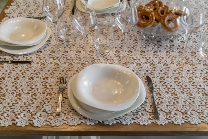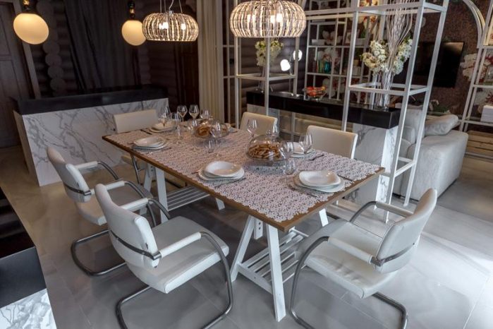 Текстильной изюминкой проекта стала роскошная и элегантная скатерть из коллекции Espocada Charm. Это макраме с воздушным растительным рисунком, выполненным в духе Le Belle Epoque. Оно не только подчеркивает утонченный художественный вкус владельцев, но и визуально смягчает прямые линии металлических конструкций.