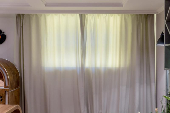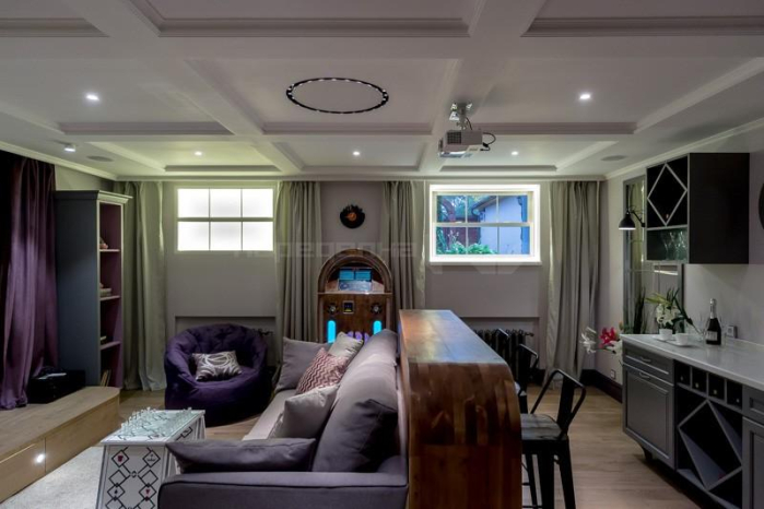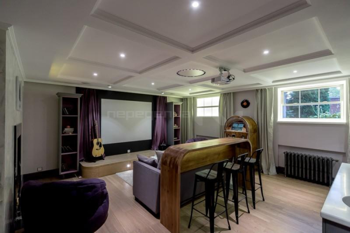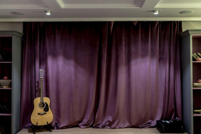 Для декора главного элемента интерьера, сцены, был выбран мягкий бархат Espocada «Aura» в глубокой лиловой гамме. Две части занавеса формируют изящное обрамление и скрывают экран, который благодаря текстилю превращается в картину в изящной раме. Очень легкий и необыкновенно прочный бархат станет практичным выбором для стильного интерьера. Деликатный блеск изящных складок добавит в декор энергию и живое тепло.