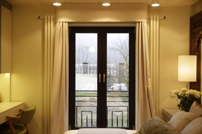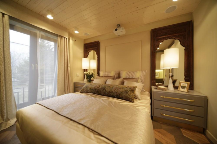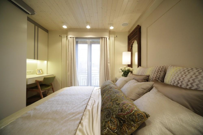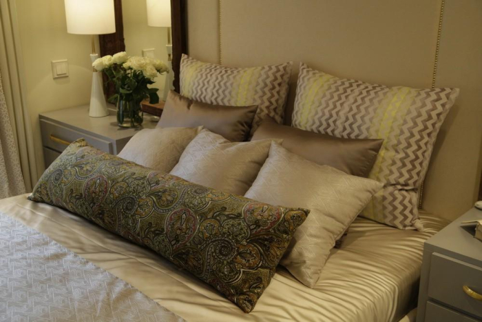 На кровати плед из плотного жаккарда «La Vita» со стилизованным этническим рисунком. Сочетание фактуры и проработки линий узора подчеркивает благородный характер ткани. Для подушек были выбраны интересные фактуры и дизайны из коллекций «La Vita», «Duos», «Continent» и «Celebrity».