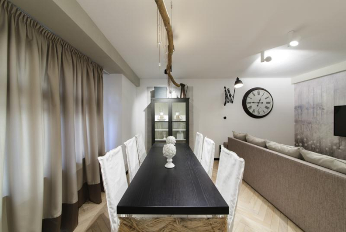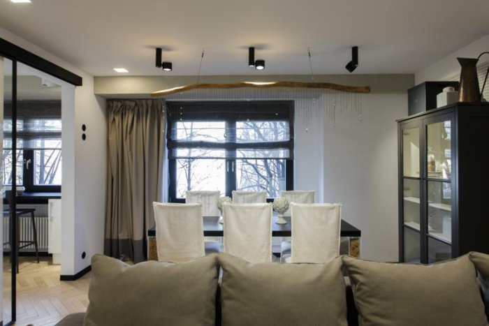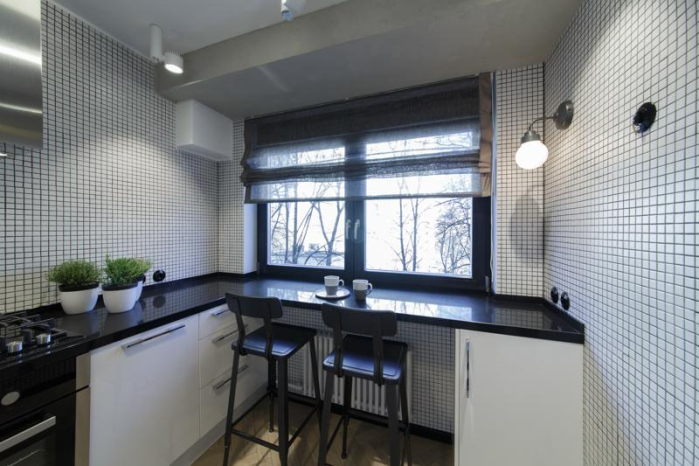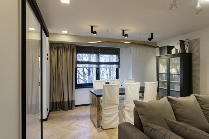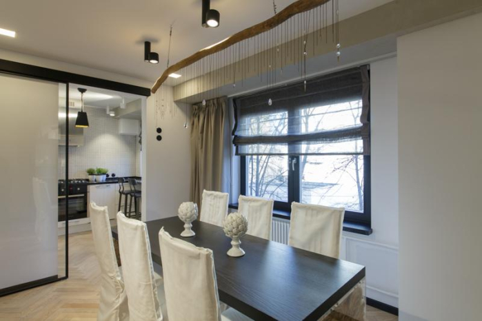 В проекте Виктории Колос много необычных комбинаций тканей и фактур. На кухне – римская штора с жаткой «Twilight» из натурального льна. Графитовый оттенок в этом году стал одним из самых модных и востребованных. Подклад – из однотонного сатина «Duos» оттенка мокко. Приятная мягкая фактура оттеняет грубоватую поверхность жатки. на контрасте с грубой поверхностью жатки. Римская штора в зале – из все той же жатки «Twilight». Она декорирована обтачкой из однотонного сатина «Duos».
