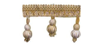 Бахрома с двумя шариками на широкой тесьме из окрашенных нитей, вес изделия - 140г/м, упаковка по 25 м на картон