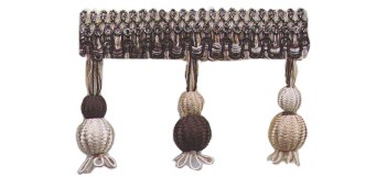 Бахрома с двумя шариками на широкой тесьме из окрашенных нитей, вес изделия - 140г/м, упаковка по 25 м на картон