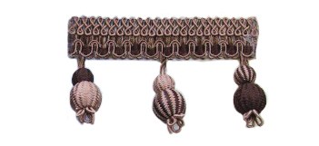 Бахрома с двумя шариками на широкой тесьме из окрашенных нитей, вес изделия - 140г/м, упаковка по 25 м на картон