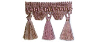 Бахрома с кисточками на широкой тесьме из окрашенных нитей, вес изделия - 120 г/м, упаковка по 25 м на картон