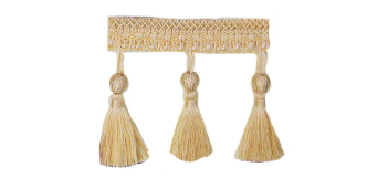 Бахрома с кисточками и шариками на широкой тесьме из окрашенных нитей, вес изделия - 150 г/м, упаковка по 25 м на картон