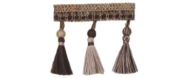 Бахрома с кисточками и шариками на широкой тесьме из окрашенных нитей, вес изделия - 150 г/м, упаковка по 25 м на картон