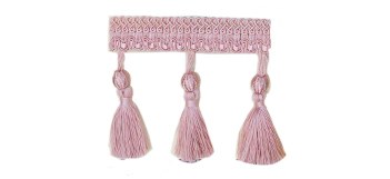 Бахрома с кисточками и шариками на широкой тесьме из окрашенных нитей, вес изделия - 150 г/м, упаковка по 25 м на картон