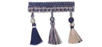 Бахрома с кисточками и шариками на широкой тесьме из окрашенных нитей, вес изделия - 150 г/м, упаковка по 25 м на картон