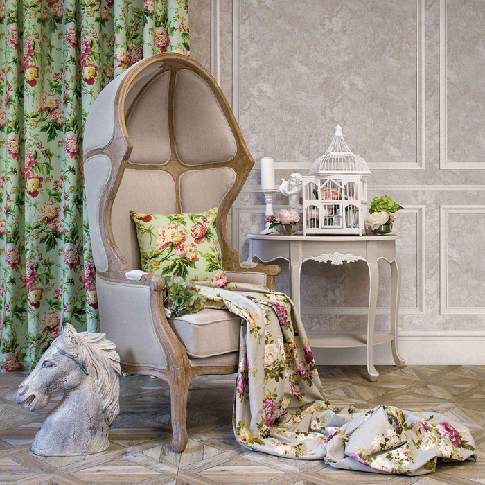 «Amberley» — это солнечные краски английского сада. Ткани с великолепными цветочными принтами передают ощущение летнего тепла и очарование роскошного сада в английском поместье. В качестве орнаментов выбраны хорошо узнаваемые и любимые цветы: розы, сирень, пионы и тюльпаны, которые украшают сад и поднимают настроение.