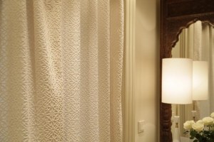Обратите внимание, что портьера и бандо сшиты из необычной ткани. Это бархат молочного оттенка с марокканской решеткой из коллекции восточных тканей «Elixir». Оригинальный рисунок заимствован из декоративно-прикладного наследия Востока. Он был стилизован и переработан в духе современной эстетики. Объемный фактурный рисунок на ткани выглядит как произведение искусства. Хорошо проработанный дизайн заполняет все пространство окна. Линии рисунка напоминают филигранную резьбу в восточном стиле. Короткий и плотный ворс замечательно держит форму и придает ткани объем.