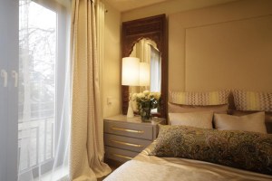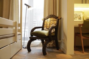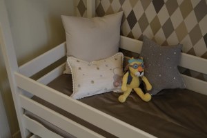 И в спальне, и в детской мы решили повесить шторы из одинаковой ткани с восточным рисунком. Это своеобразный мостик между двумя комнатами. Он объединяет интерьеры в красивую и понятную концепцию.