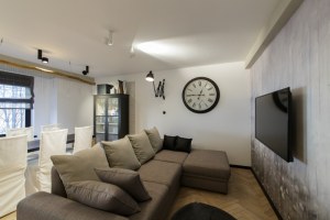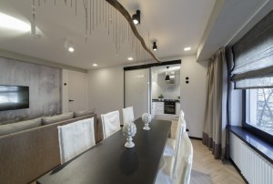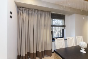 Римская штора в зале отшита из все той же основной ткани «Twilight» в графитовой гамме. На этот раз мы обошлись без подкладки. Чтобы штора выглядела интереснее, по краям сделана аккуратная обтачка из сатина в мокко. С ней штора смотрится как картина в изящном обрамлении.