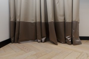 Основная портьера отшита из мягкой и нежной ткани «Shamrock». Это искусственная шерсть – очень необычная и во многом уникальная. На ощупь ее невозможно отличить от натуральной шерсти. Она такая же мягкая, нежная и по-домашнему теплая. Однако в повседневном использовании она оставила натуральную шерсть далеко позади. Ее можно стирать и гладить, чего натуральная шерсть категорически не переносит. Еще ткань из коллекции «Shamrock» не вытягивается, а это очень важно для внешнего вида наших штор.