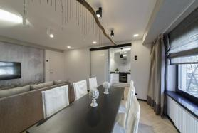 Окно на кухне и в зале мы декорировали римскими шторами графитового оттенка. Это один самых модных цветов нового сезона. Он часто встречается не только в текстиле, но и в предметах мебели.