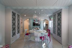 Римская штора в обновленной гостиной создана из мягкой и удивительно нежной искусственной шерсти «Shamrock». Спокойный молодой оттенок мяты задает общее настроение интерьера, прекрасно сочетаясь с отделкой из натуральных материалов. Яркий сочный кант цвета фуксии выступает в качестве стильной цветовой доминанты. Этот же акцент продолжается в мебельной обивке и декоративных подушках. Приятная фактура как нельзя лучше развивает идею дачной истории и дома для большой и дружной семьи.