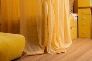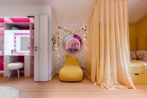 Фактурный тюль нежнейшего лимонного оттенка помог выделить спальную зону, подарив для одной из девочек собственное небольшое пространство в комнате. Благодаря легкости и прозрачности материала, дизайнеры добились воздушного эффекта зонирования, не утяжеляя пространство тяжелой драпировкой и плотными материалами. У хозяйки спального места осталось ощущение приватности, но при этом за драпировкой тюля есть возможность видеть происходящее в детской.