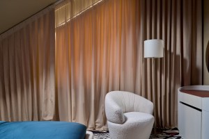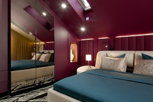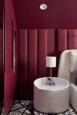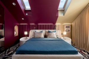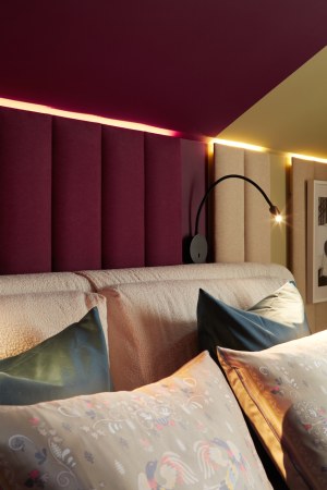 Основной акцент в новом интерьере сделан на глубокий пурпурный цвет — он был выбран для стен и мягких стеновых панелей, обитых тканью Etude (243) из коллекции Art Seasons от Venesto. Матовая, не гладкая ткань идеально подошла для спальни, а натуральная нить в составе придала дополнительный шарм за счет фактурности и легкого пушка от хлопка.