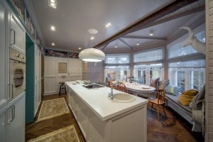 Вытянутая проходная кухня превратилась в просторный эркер с островом в стиле французского охотничьего домика.