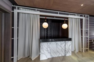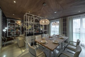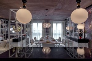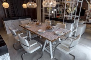 Сиреневые бревна, мозаичное панно, мраморная мебель и ажурные металлические конструкции украсили деревянный сруб и создали в нем удивительное настроение.