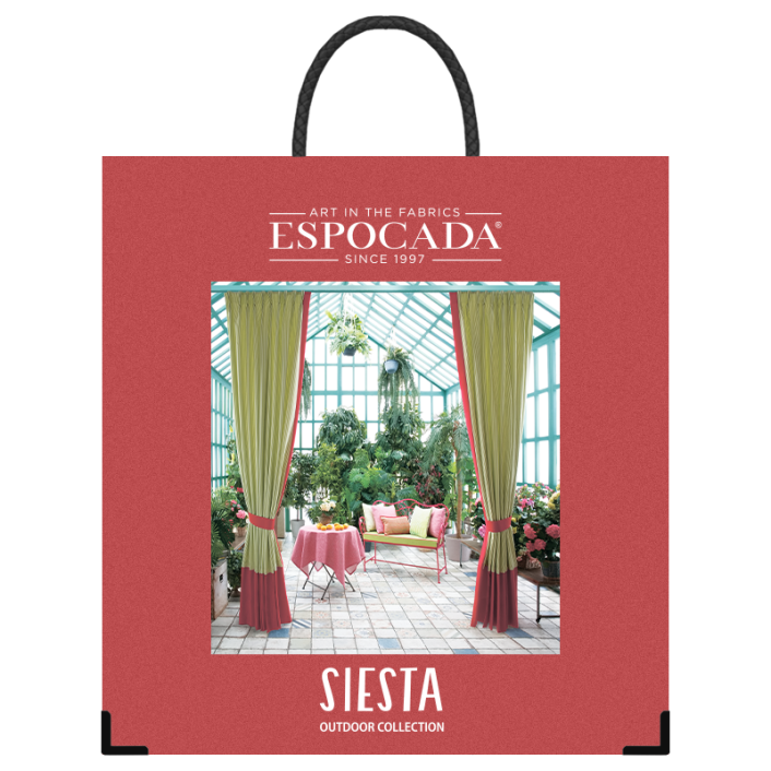 Первая для Espocada коллекция outdoor-тканей, большая часть которых сделана из олефина. Каталог характеризует высокая износостойкость, устойчивость к выцветанию и воздействию солнечных лучей. Антибактериальная пропитка делает новую коллекцию идеальной для текстильного оформления балкона, террасы с бассейном, открытой веранды, яхты.