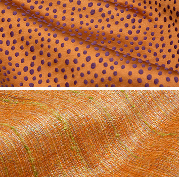 Обе ткани в коллекции — достаточно мягкие, но в драпировке отличаются красивыми складками. Ткань, имитирующая дикий шелк, обладает фактурностью, неоднородной структурой, неровными узловатыми утолщенными нитями. Гладкий и ровный сатин с декоративными элементами, напротив, контрастирует с окрашенными разноволоконными нитями.